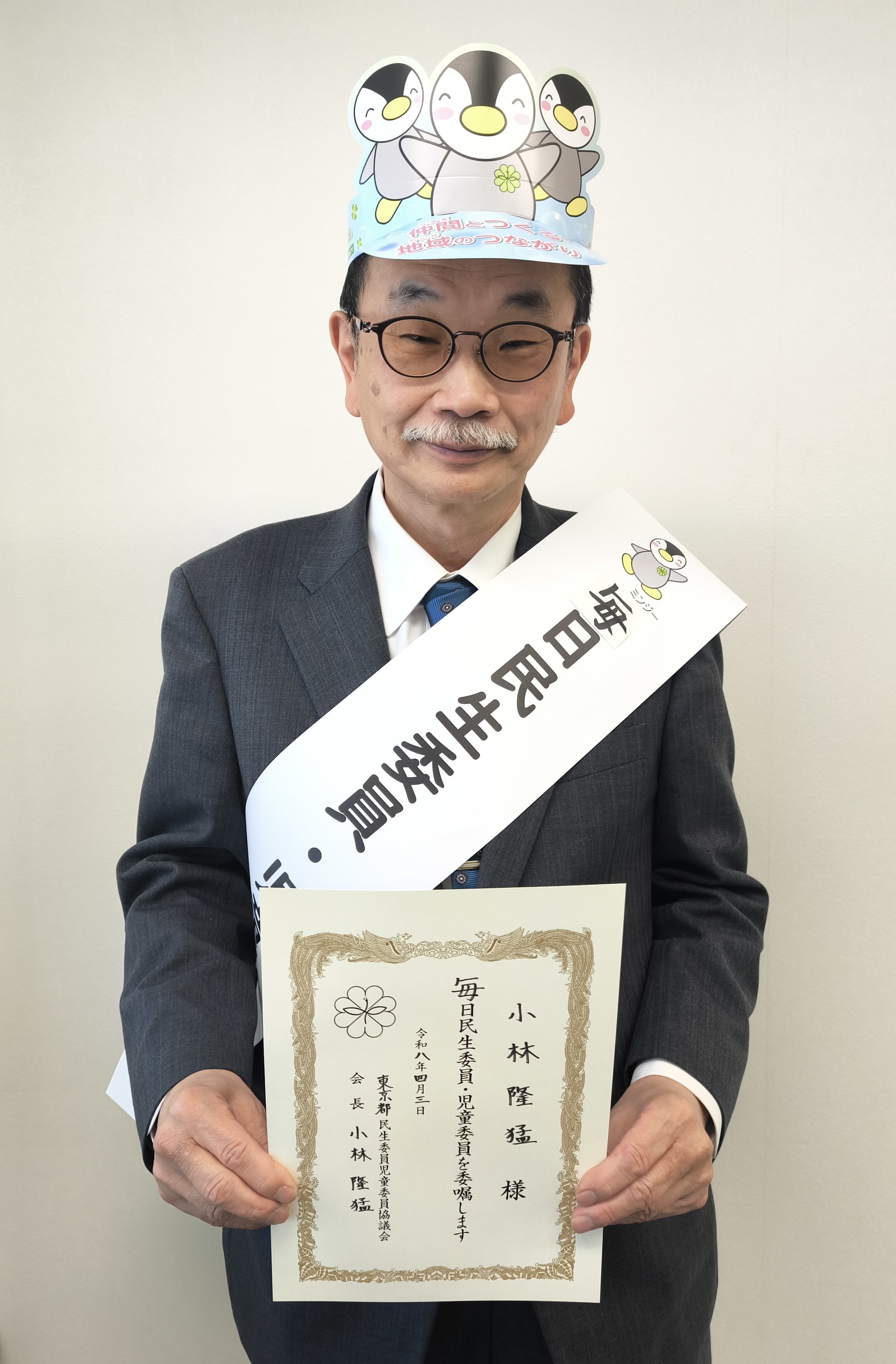 本会の小林隆猛会長(「隆」は旧字体)にサンバイザーと「毎日民生委員・児童委員」のたすきを身に着けていただきました!サンバイザーの背面には切り込みがあり、サイズ調整も可能です。とても似合っていますね♪